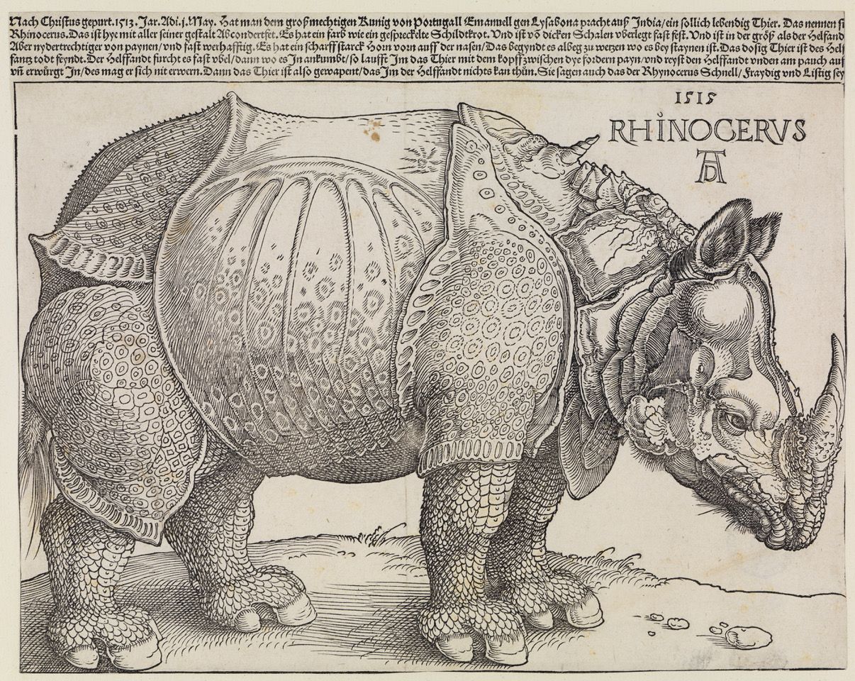 Einem echten Dickhäuter ähnelt das Wesen zudem noch weit weniger als Dürers so einflussreiches wie realitätsfernes Rhinocerus, mit dem es die Profilansicht, die Platzierung der Legende und die detaillierte Musterung teilt. Sein Horn ragt nicht vom unteren Ende der Schnauze über Maul und Nüstern hinaus, sondern, wie bei einem Einhorn, von der Stirn empor, zwischen den aufgerichteten Ohren, deren Wellenform es aufgreift. Die Form der Ohrmuscheln erinnert eher an die eines Elefanten als an die kleinen Lauscher eines Breitmaulnashorns. Der Rumpf windet sich in die falsche Richtung, das Auge ist zu groß und die mit Stacheln besetzten Beine, die unten in beide Richtungen stabilisiert werden, wirken übermäßig massiv. Ein früherer Betrachter hat das Wesen einmal als Kreuzung zwischen Languste und Stachelschwein beschrieben.1 Mich erinnert es mit seinem langen, schuppigen Schwanz vage an ein Gürteltier.