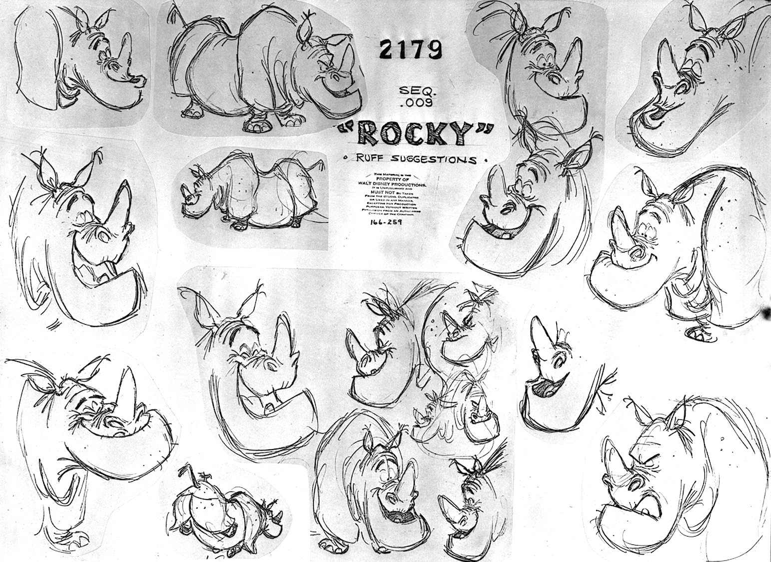 Die verfremdende Darstellung der Tierzeichnung und ihrer Legende lässt auch kulturelle Codierungen ins Leere laufen. Und an solchen mangelt es dem Nashorn nicht, wie die Historikerin Kelly Enright anhand einer Anekdote zeigt: Ursprünglich sollte in der animierten Version von Rudyard Kiplings The Jungle Book (1967) ein sprechendes Panzernashorn namens »Rocky the Rhino« auftreten. Doch Rocky schaffte es nie auf die Kinoleinwand. Übrig blieben nur die Stimmaufnahmen des Komikers Frank Fontaine, Storybook-Zeichnungen2 und ein Modellbogen mit »ruff suggestions« des Trickfilmzeichners Milt Kahl, auf dem Rocky mit wechselnden Gesichtsausdrücken und aus verschiedenen Perspektiven zu sehen ist, meist dümmlich auf sein eigenes Horn schielend. Enright führt diesen Ausschluss des Nashorns aus dem Kreis der sprechenden Dschungeltiere auf die jahrhundertealte Wahrnehmung des Rhinozeros als Symbol für exotische Fremdartigkeit, urwüchsige Wildheit und ungezügelte Gewalt zurück. Jeder Versuch, das Tier zu vermenschlichen, habe daher nur grotesk erscheinen können: »Even Walt Disney – a man who seemed to be able to imagine words into the mouths of any creature – could not come to terms with a talking rhinoceros«3.
