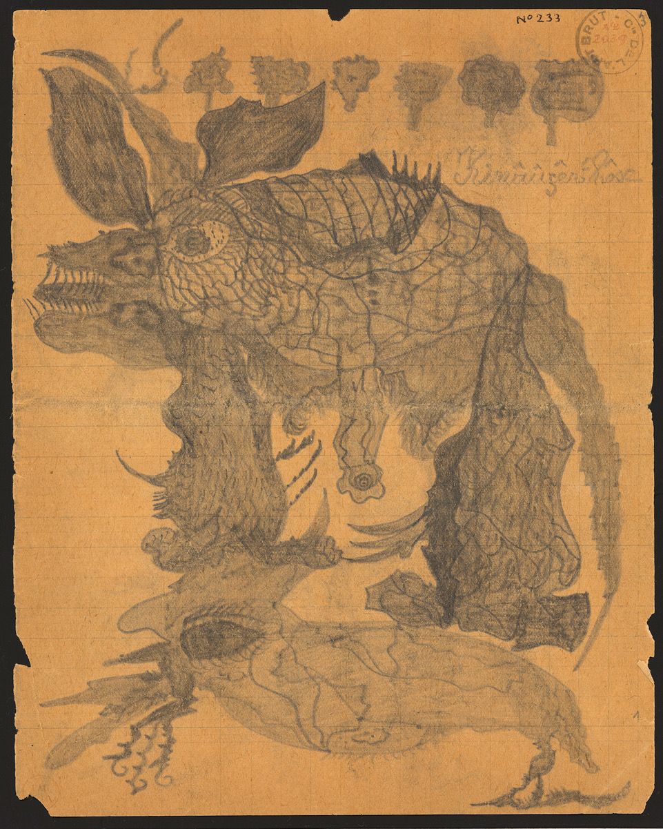Tatsächlich war der Versuch, diesem und anderen Bildern desselben Zeichners ihre Leerstellen auszutreiben, zunächst nicht der einer kunsthistorischen Interpretation. Es stammt aus einer psychiatrischen Klinik in der Nähe von Lille im Norden Frankreichs und ist eine der frühesten erhaltenen Zeichnungen von Gaston Dufour (1920–1966), der dort von seinem 20. Lebensjahr bis zu seinem Tod interniert war. Nach einiger Zeit bemerkte das Klinikpersonal, dass dieser als teilnahmslos und schweigsam geltende Patient eigenartige Figuren, hauptsächlich Tiere, auf Zeitungsränder, Zettel oder Notizbuchseiten zeichnete und diese in seiner Kleidung aufbewahrte (was wahrscheinlich die sichtbare Faltkante erklärt).6 Im Laufe der Zeit wurden Dufours Zeichnungen immer größer und bunter, denn als sein Arzt Paul Bernard darauf aufmerksam wurde, begann er, ihn mit Papier, Buntstiften und Aquarellfarben zu versorgen. Eine Auswahl seiner Arbeiten wurde 1950 als Leihgabe an die Pariser Klinik Sainte-Anne geschickt, wo sie im Rahmen des ersten Weltkongresses für Psychiatrie in einer Ausstellung für ›psychopathologische Kunst‹ gezeigt wurden.7